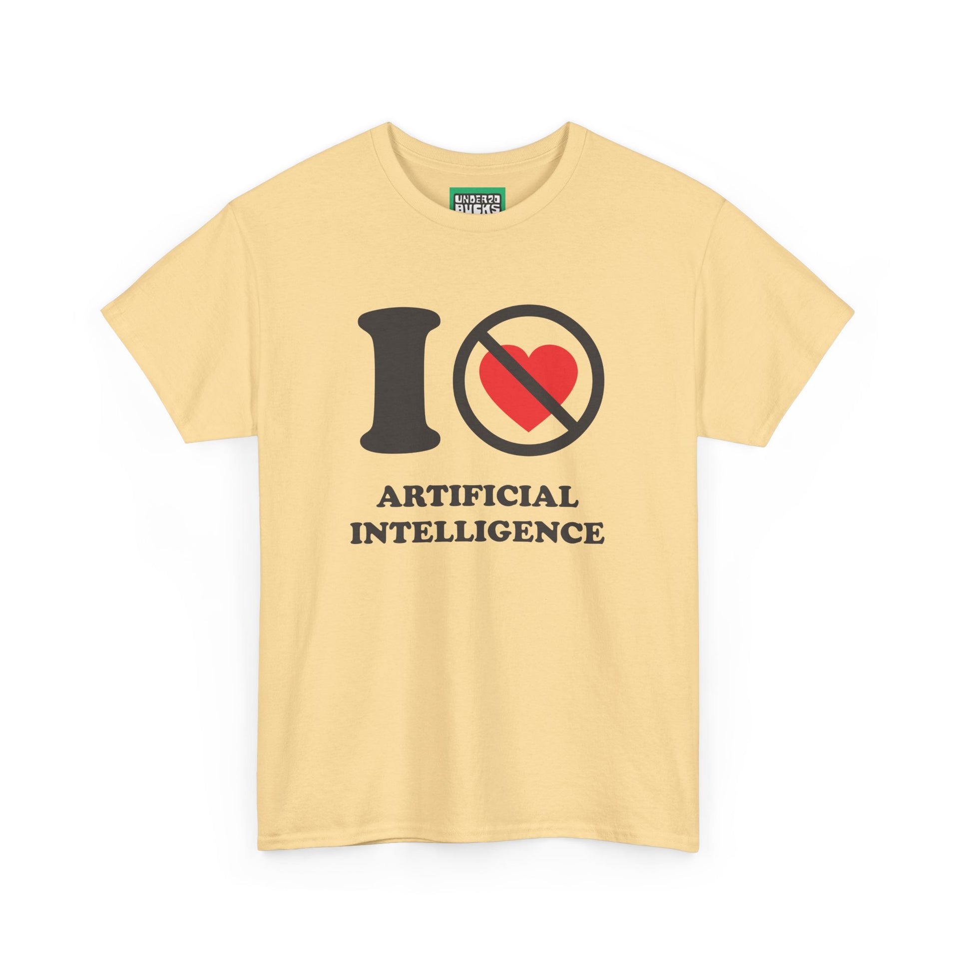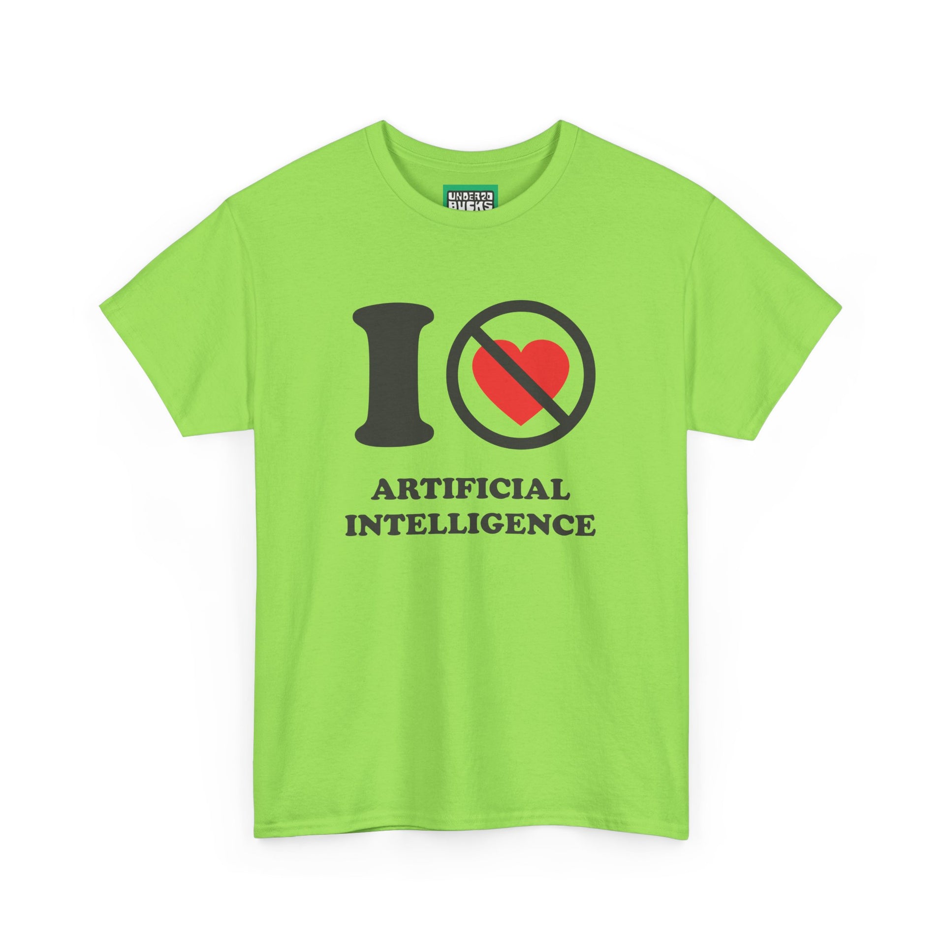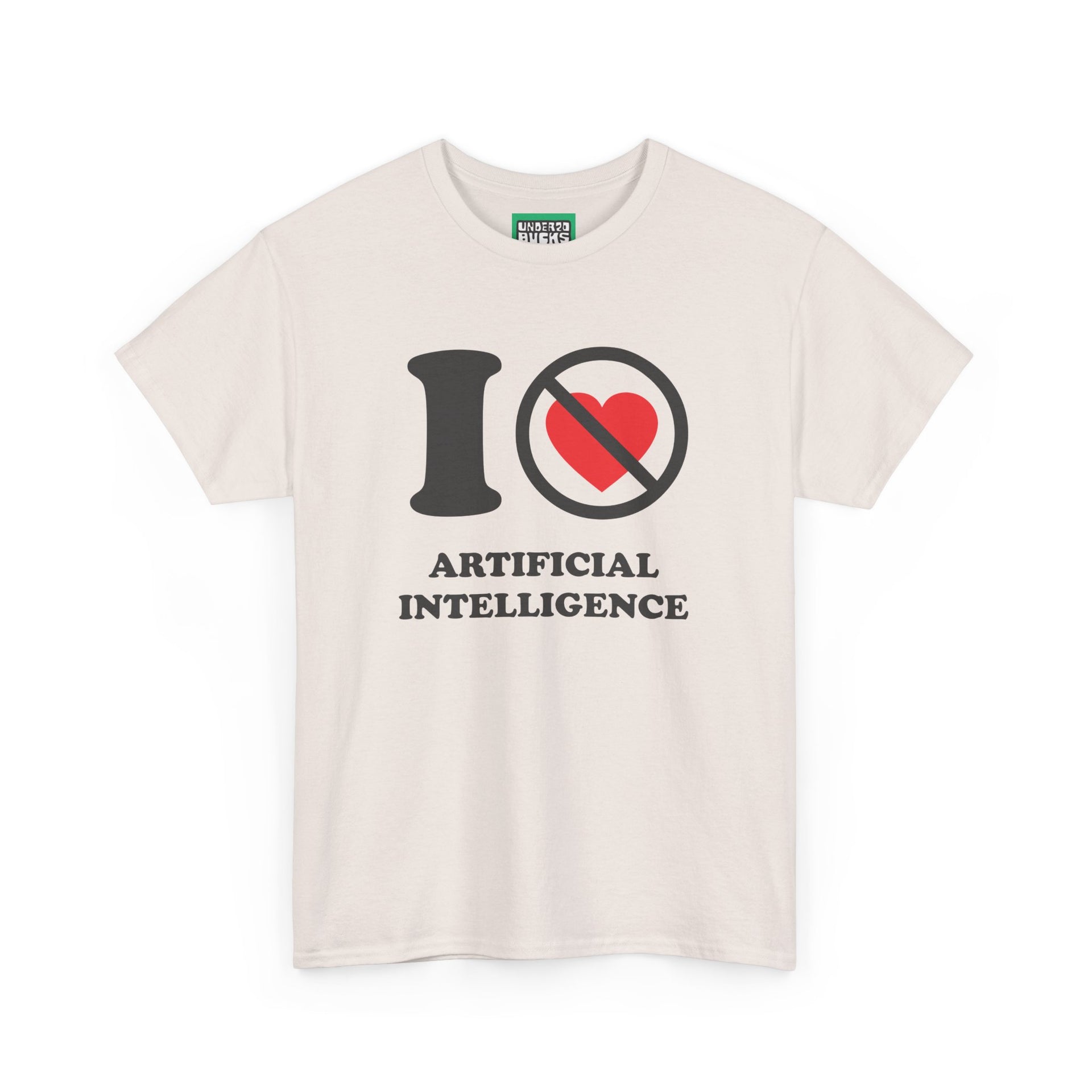This concise yet impactful t-shirt design conveys a clear message - the wearer has a negative fondness for artificial intelligence. The NOT heart symbol paired with the text "Artificial Intelligence" creates an eye-catching, straightforward statement.