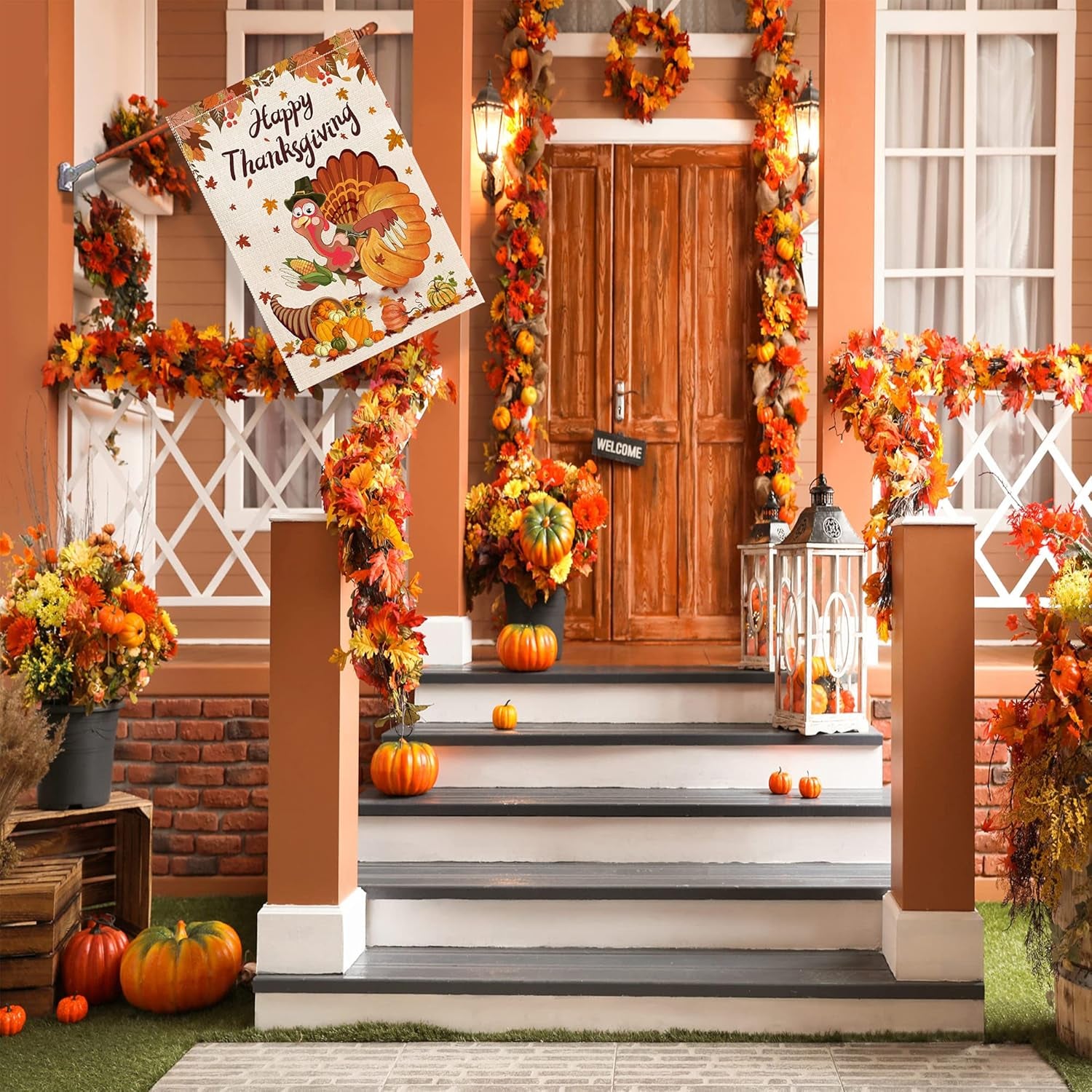 - WIDE APPLICATION: Burlap thanksgiving house flags 28x40 double sided are a seasonal fall thanksgiving yard decorations outdoors, perfect for patio, porch, veranda, lawn, yard, wall decor or window and make charming decorative statements for this.